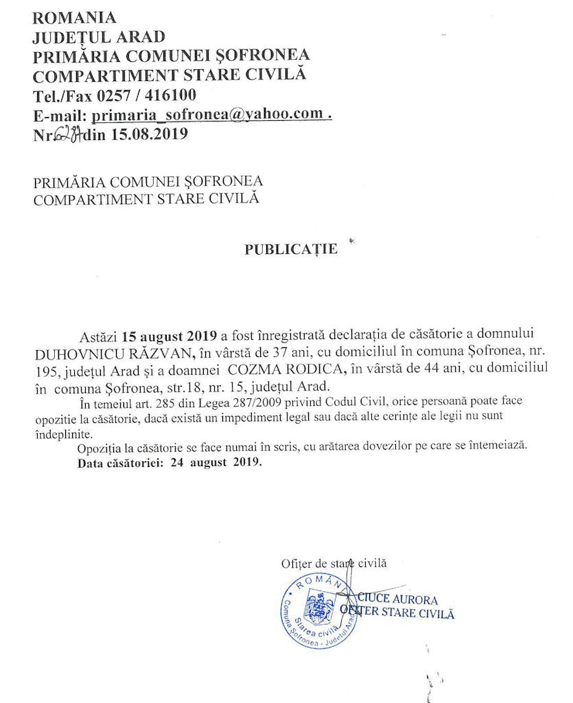 Publicație de căsătorie – Duhovnicu Răzvan / Cosma Rodica