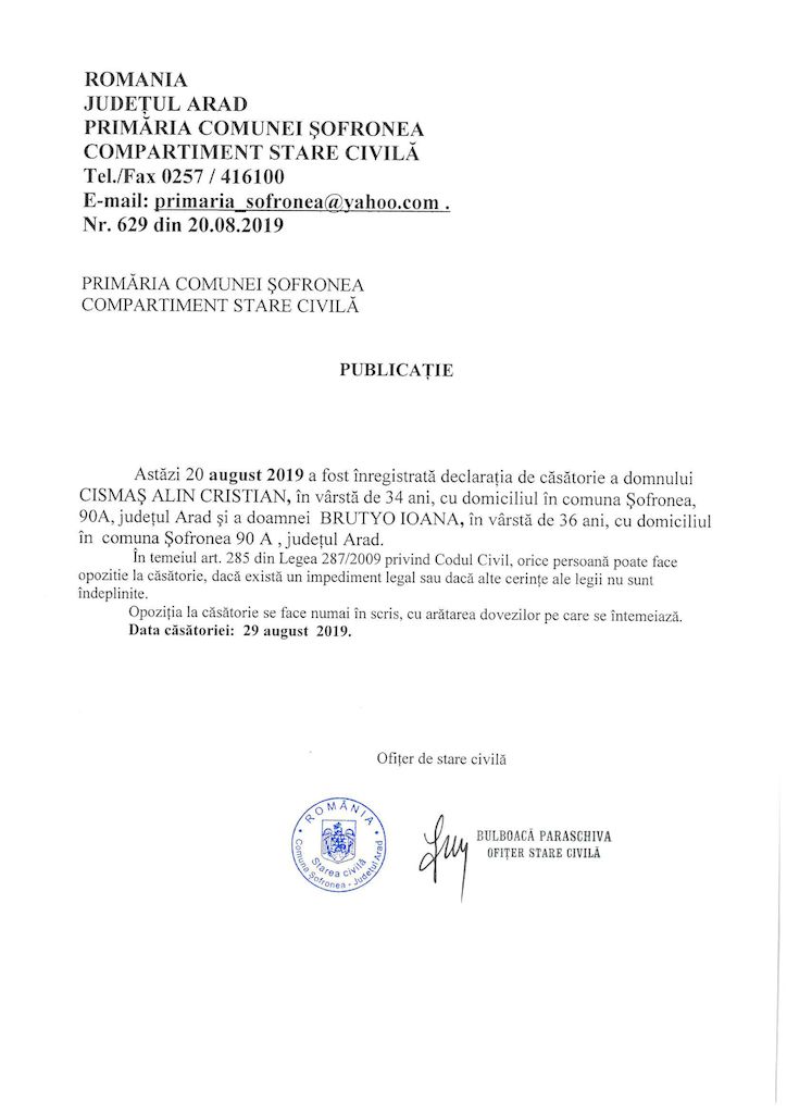 Publicație de căsătorie – Cismaș Alin-Cristian / Brutyo Ioana