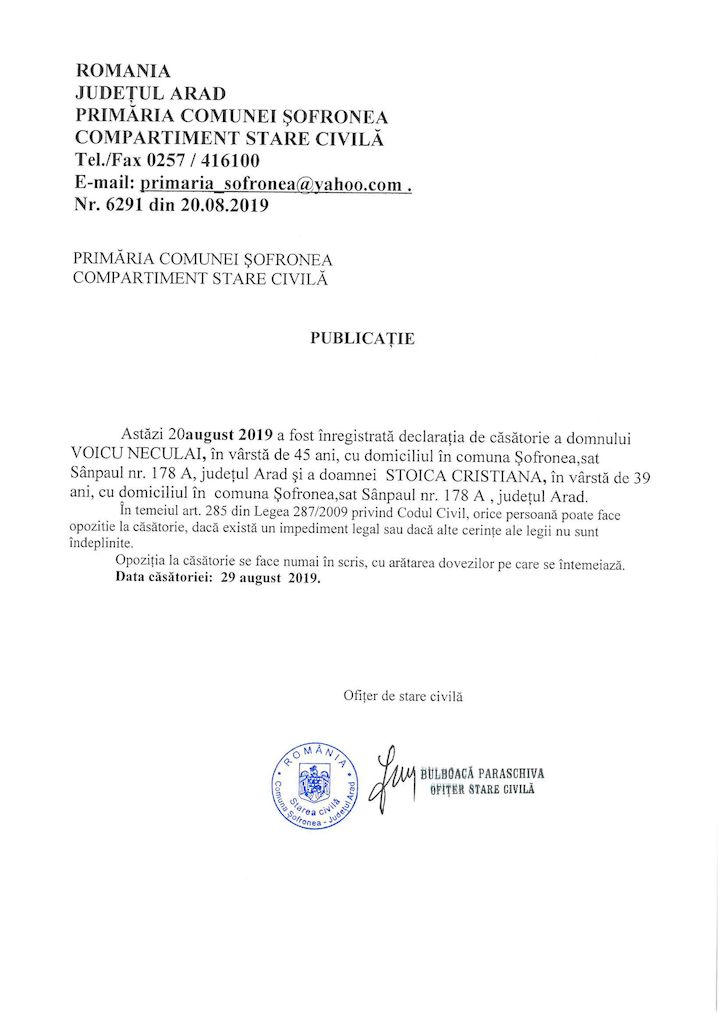 Publicație de căsătorie – Voicu Neculai / Stoica Cristiana