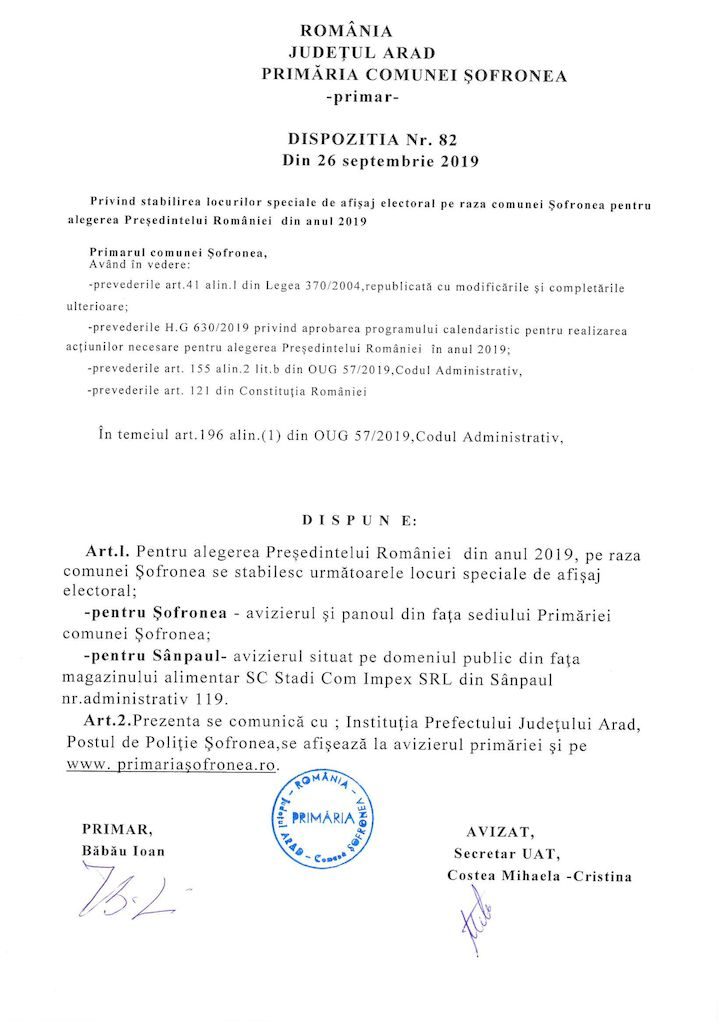 Dispoziția nr. 82 / 26.09.2019 – privind stabilirea locurilor de afișaj electoral