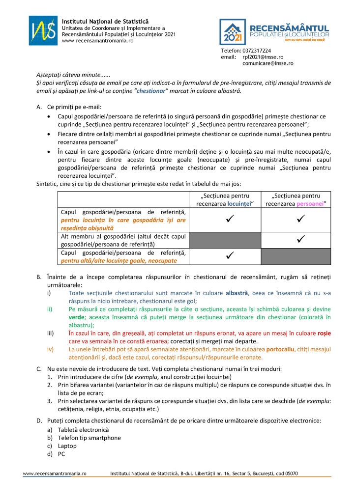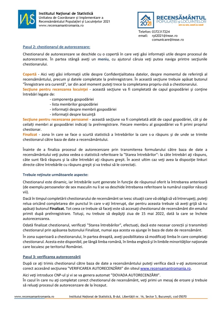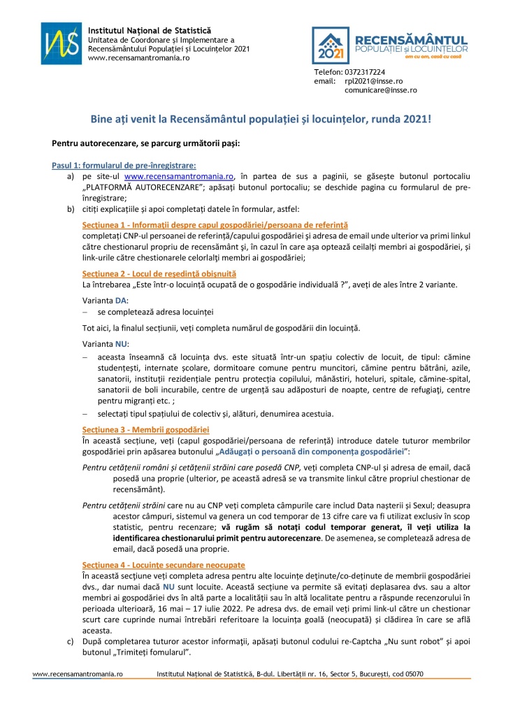 In vederea desfasurarii in bune conditii a Recensamantului Populatiei si Locuintelor din Romania, in aceasta perioada este necesar a se realiza recrutarea, selectia si instruirea personalului de recensamant, cu prioritate a recenzorilor pentru autorecenzare asistata.