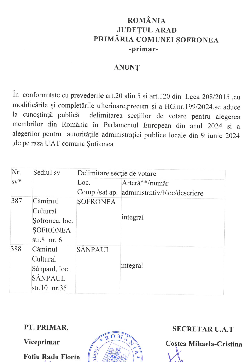 *Titularul investiției: Comuna Șofronea jud. Arad