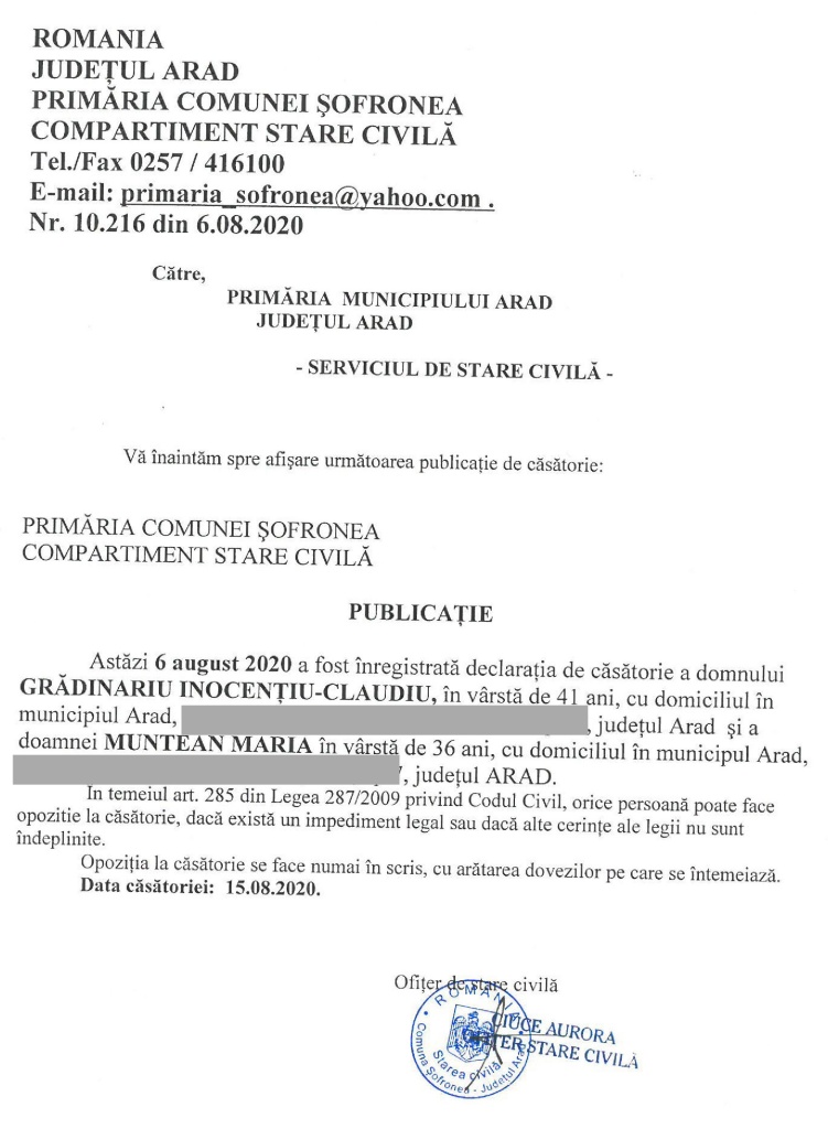 Publicație de căsătorie – Grădinariu Inocențiu-Claudiu / Muntean Maria